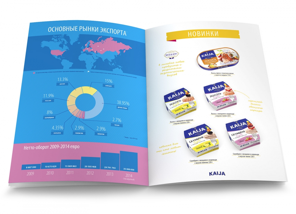 The brand Kaija, owned by the company Karavela Ltd, at the moment is one of the leading fish processing companies and canned fish producers in the industry, with export to 26 countries in the world, including Western Europe, Scandinavia, Asia, Russia, USA etc. and increase in net turnover of more than 5 million Euros each year. In very exciting cooperation during the year we have worked out and created new packaging design and visual appearance of the product to approximately 90 product units. The brand got a fresh and modern design, with rich colors and tasty product photography.